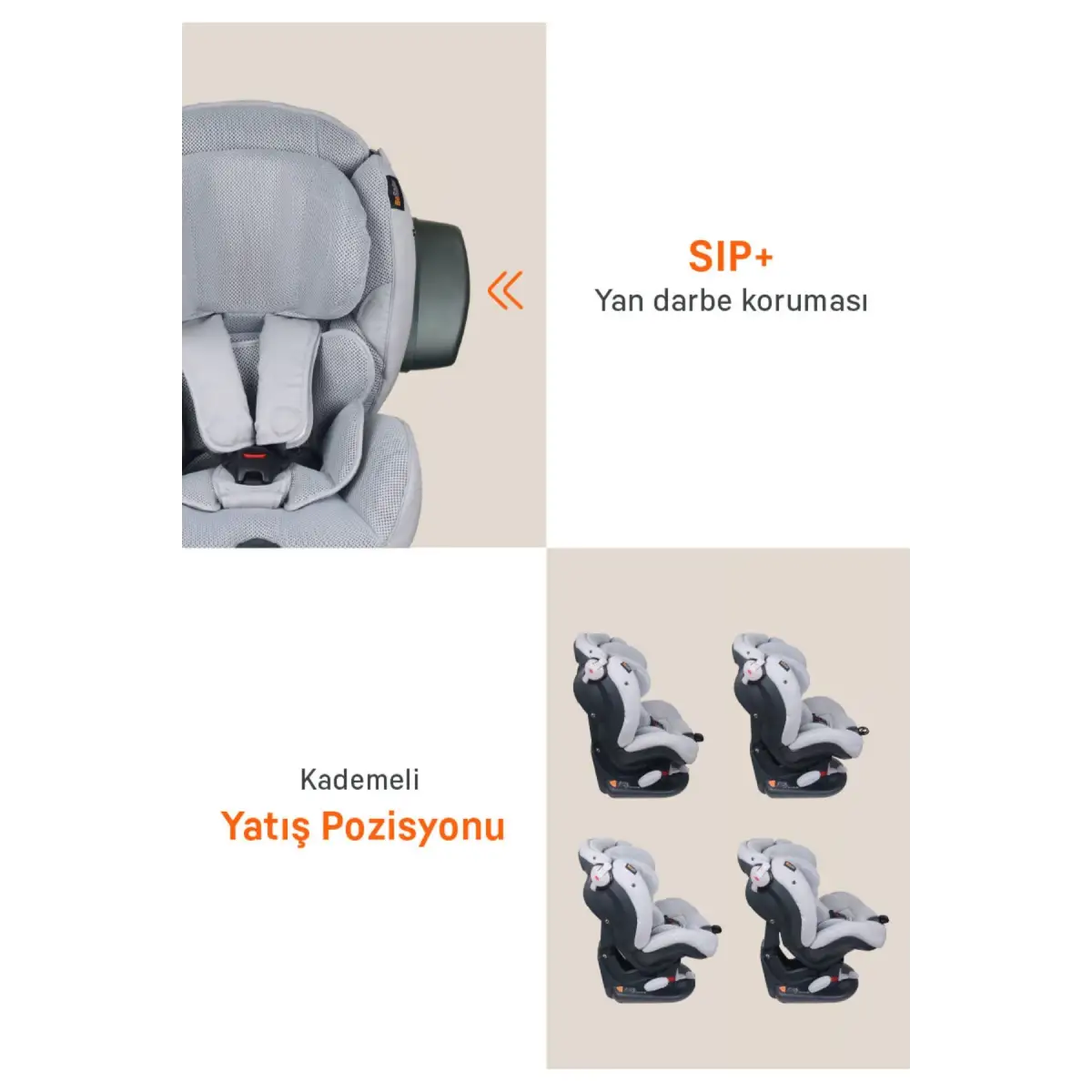 - Darbeyi absorbe eden SIP+, koltuğun iç ve dış kısmına yerleştirilmiş olup, baş ve vücut için çok iyi yan darbe koruması sağlar.