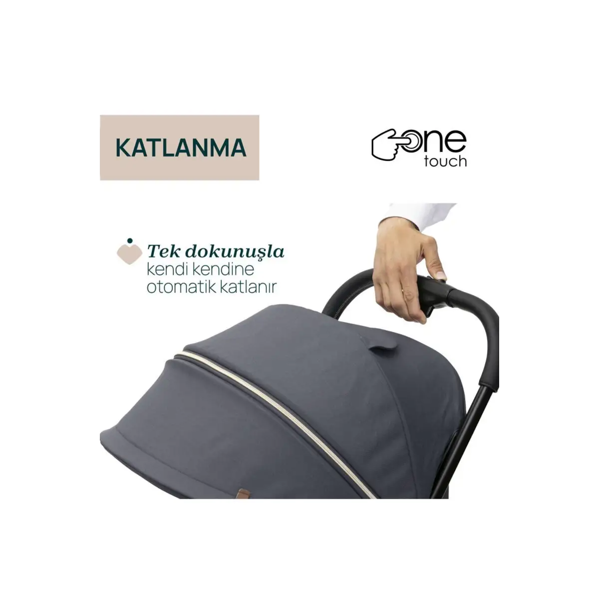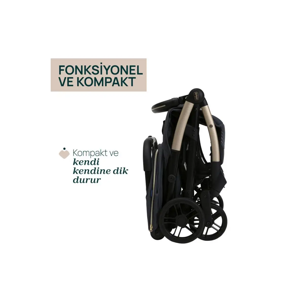 KENDİ KENDİNE KATLANIR: Tek bir hareketle bebek arabası kendi kendine katlanır. Katlandığında gerçekten kompakttır ve kendi kendine ayakta durur. Daha fazla kompaktlık elde etmek için ön bar da katlanabilir veya taşıma kolu olarak kullanılabilir.