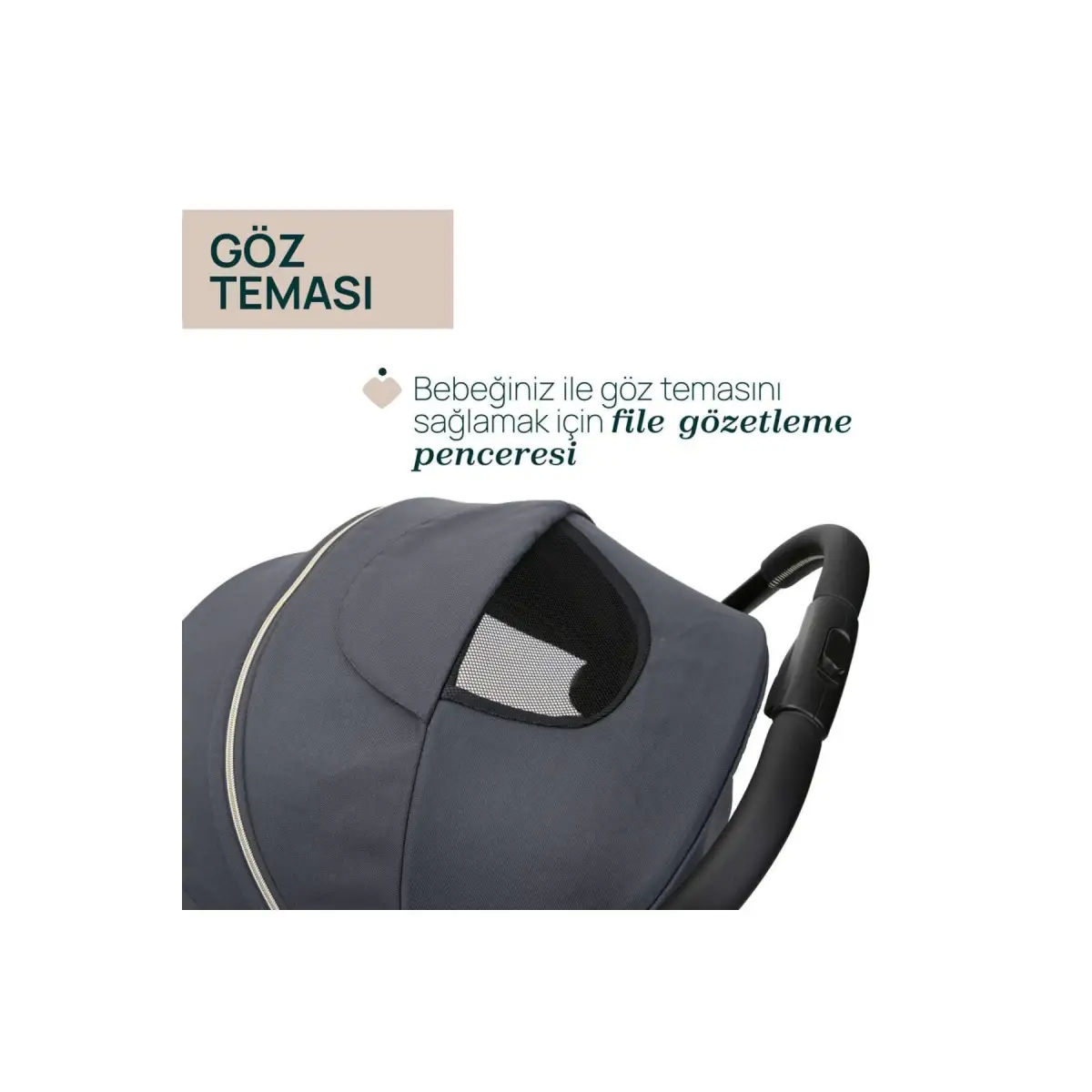 KORUYUCU GÜNEŞLİK Güneşlik UV50+ koruma ve suya dayanıklılık uygulamaları sayesinde en iyi korumayı garanti eder ve genişletilebilirdir. Bebekle göz temasını korumak için üst kısımda file gözetleme penceresi mevcuttur.